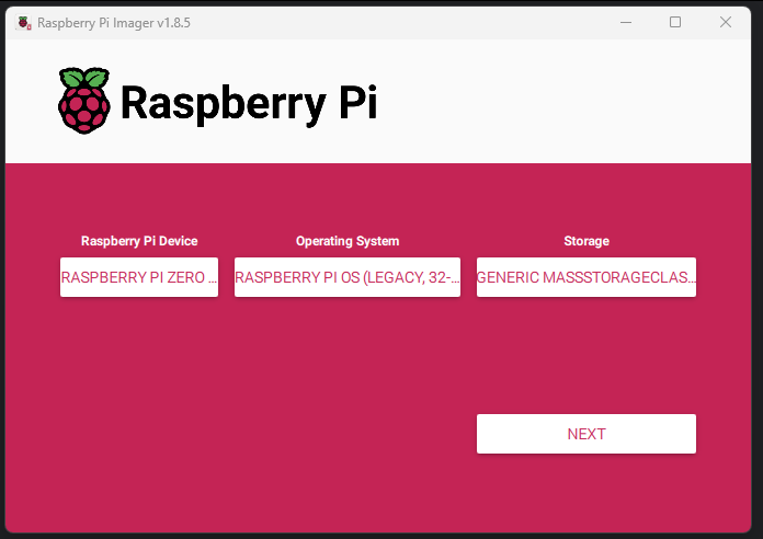 เปิดโปรแกรมขึ้นมาและเลือกอุปกรณ์ให้ตรงกับที่เราใช้, OS เลือก Legacy 32bit ส่วน Storage ก็เลือก SD Card ที่เสียบเข้าไป และกด Next