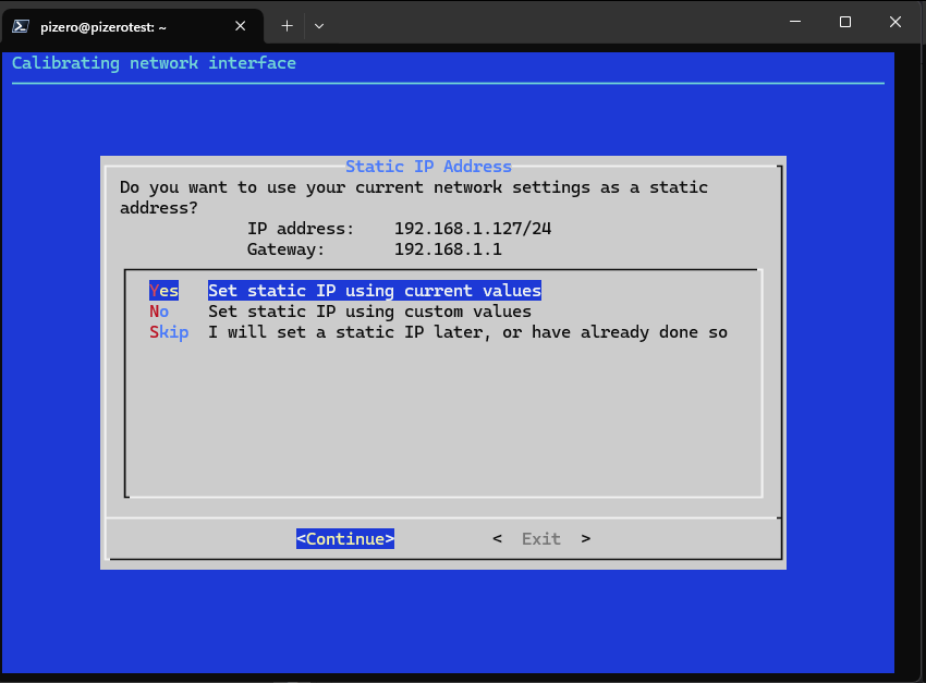 หน้าจอ Static IP จะถามเพื่อยืนยันว่าจะใช้ ip นี้จริง ๆ ในการรัน pihole หรือไม่โดย