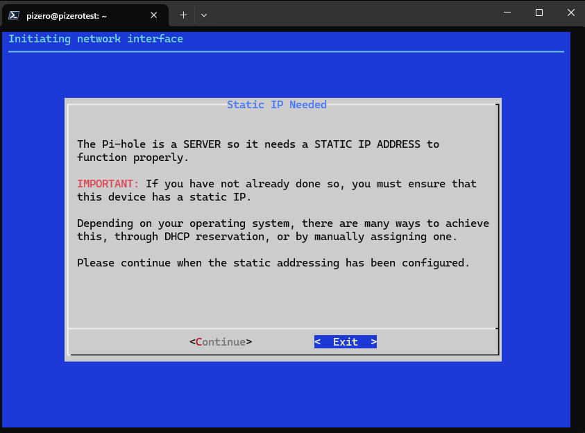 pihole จะแนะนำให้ไป fix ip ไว้ก่อน (ทำใน DHCP) ให้กด Continue
