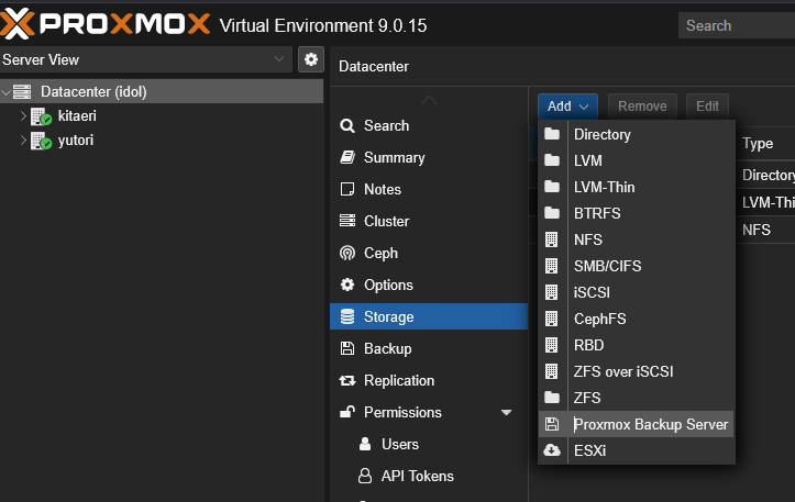 ให้ไปที่ตัว Datacenter เลยและเลือก Storage > Add > Proxmox Backup Server