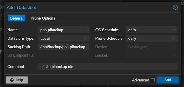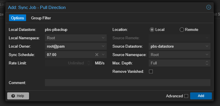 ในส่วนของ pbs web ui ให้ดูที่ Datastore > pbs-pibackup (nfs + tailscale ที่เราทำไว้) และกด Add Pull Sync Job โดย
