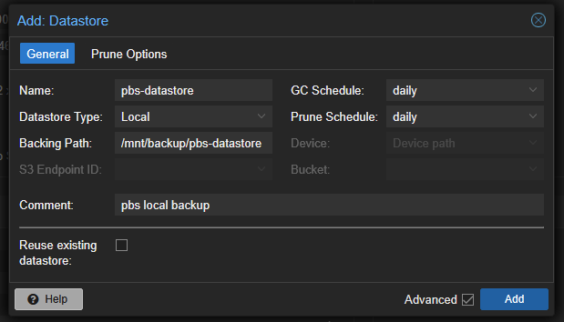 - Path - จากตัวอย่างจะใช้ pbs-datastore เป็น local ถ้ากลัวงงตั้งเป็น pbs-backup-local หรืออะไรก็ได้ให้เข้าใจ