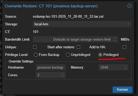 จุดอ่อนของ pbs คือหากตัว pbs (lxc) มีปัญหาหรือพัง ข้อมูลใน datastore จะไม่สามารถกู้คืนได้ เพราะต้องใช้ pbs ในการเปิด ดังนั้นควรทำ backup pbs ในรูปแบบ vzdump ธรรมดาไว้ด้วย
