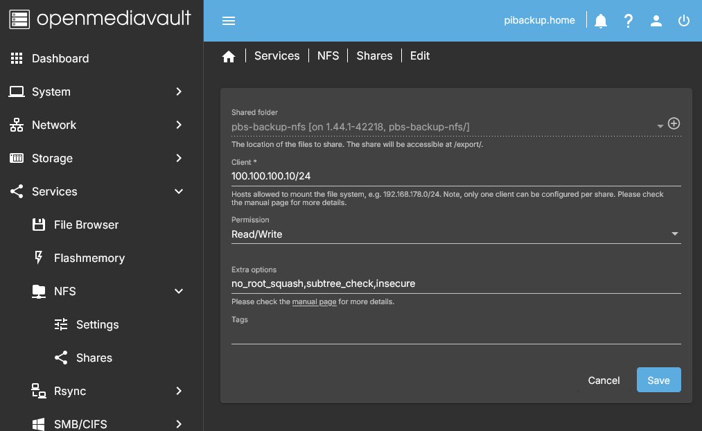 100.100.100.100:/proxmox-backup-nfs /mnt/backup/pbs-pibackup nfs defaults,_netdev,soft,timeo=150,retrans=2 0 0