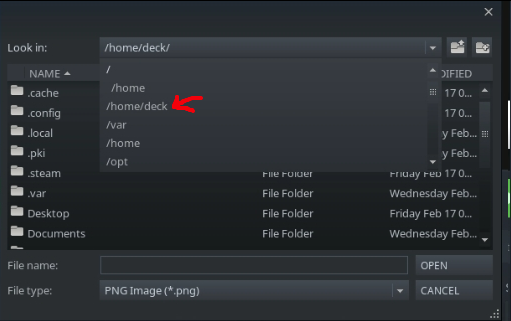 หากเซฟไฟล์ไว้ที่ Desktop ให้ค้นหาใน path ตามรูป คือ /home/deck/ และจะเห็น folder Desktop กดเข้าไปเลือกภาพปกได้เลยตามใจชอบ