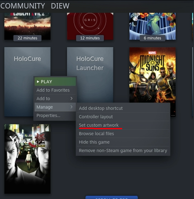 ให้กลิ้งลงไปจนกว่าจะเจอเกมที่เราจะทำ Custom Artwork เมื่อเจอแล้วให้คลิ๊กขวาทีกรอบว่าง ๆ > Manage > Set custom artwork