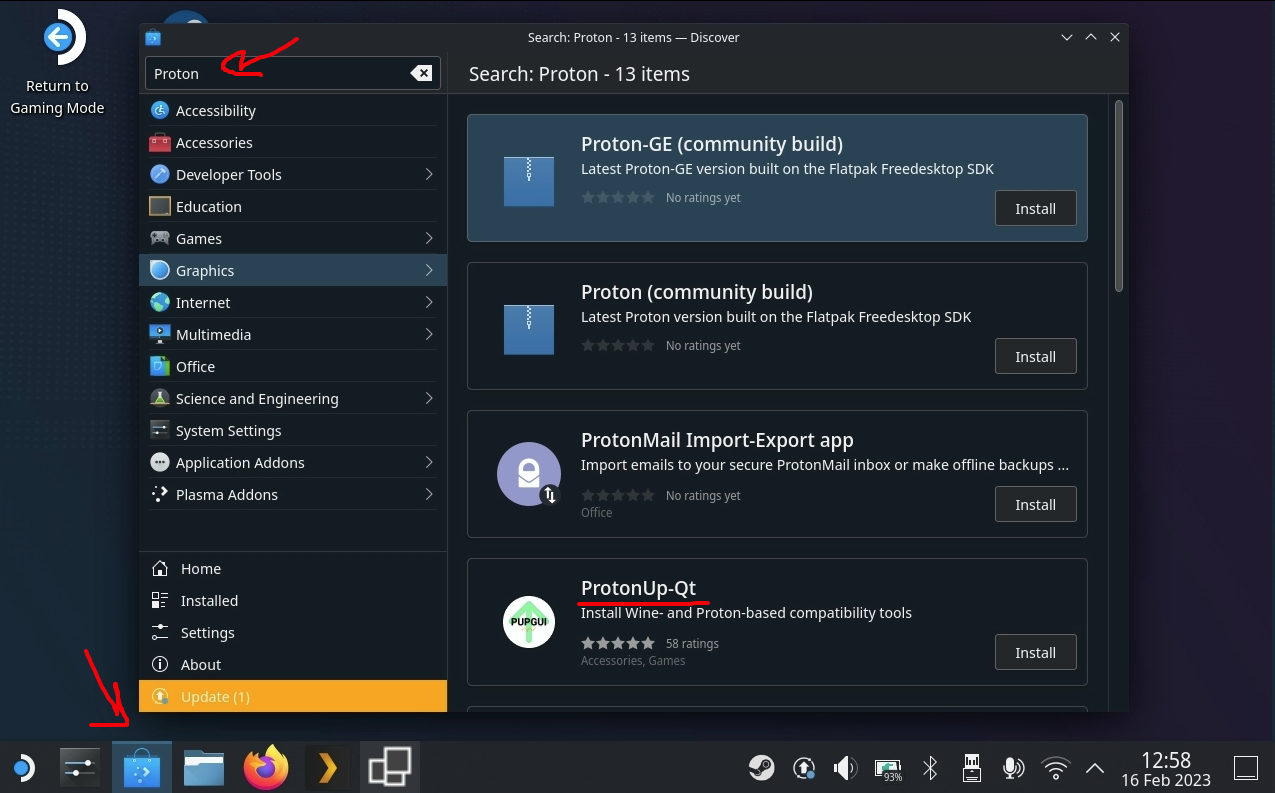 เมื่ออยู่ที่ Desktop Mode ให้ไปที่ Discover (พูดง่าย ๆ คือ App Store ของ Linux) ค้นหาคำว่า Proton และติดตั้ง ProtonUp-Qt