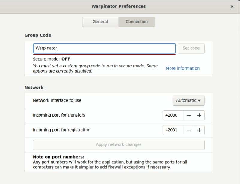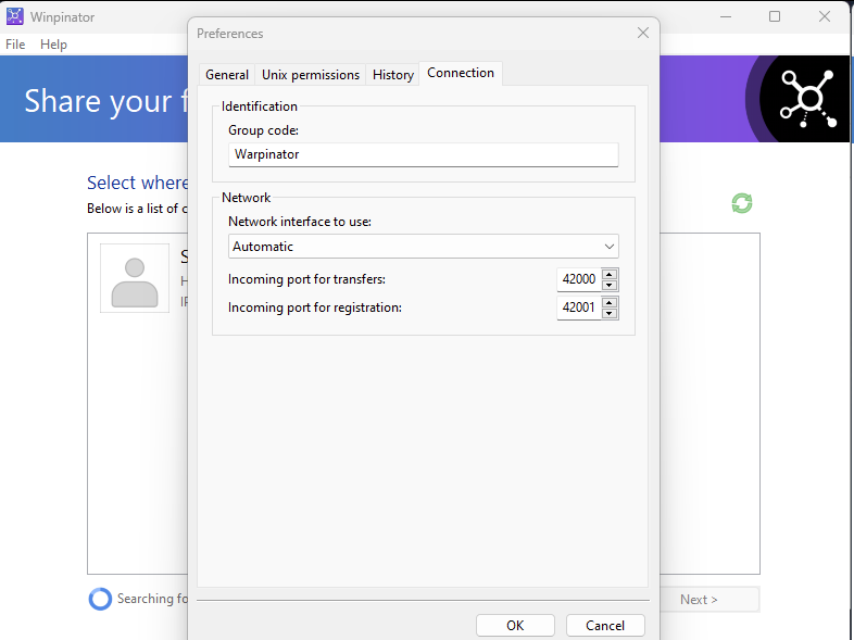 โหลดได้จาก Winpinator เมื่อติดตั้งแล้วให้เปิดและไปที่ File > Preference > Connection และตั้ง Group code ให้ตรวงกัน