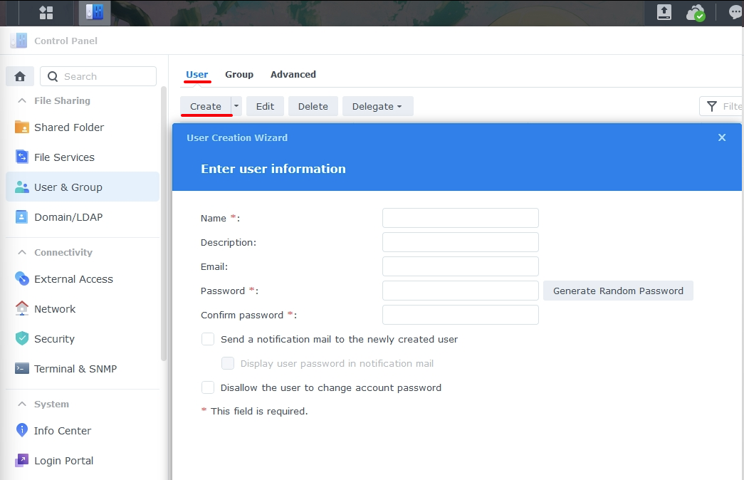 ไปที่ Control Panel > User & Group ดูตรงส่วน User และ Create
