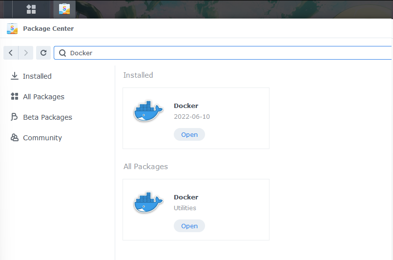 ไปที่ Package Center ดูในส่วน All Packages ค้นหา Docker และกด Install เป็นอันเรียบร้อย
