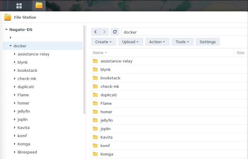 เราจะเห็นว่ามี folder Docker โผล่ขึ้นมาอีกอันหนึ่งใน File Station ซึ่ง folder นี้เราจะใช้จัดการติดตั้งโปรแกรมต่าง ๆ ของ Docker ทั้งหมด โดยโครงสร้างหลัก ๆ ก็คือ folder ละ 1 โปรแกรม ตามตัวอย่างในภาพ (folder จะใช้ตัวพิมพ์ใหญ่ก็ได้แต่ไม่แนะนำ)