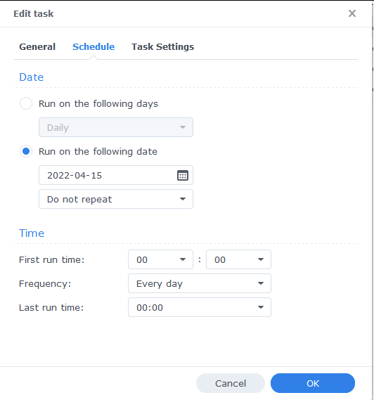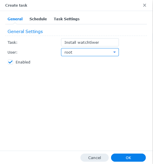 - tab General ตั้งชื่อ task เป็นอะไรก็ได้ไม่มีผลอะไร ส่วน user ให้เลือกเป็น root