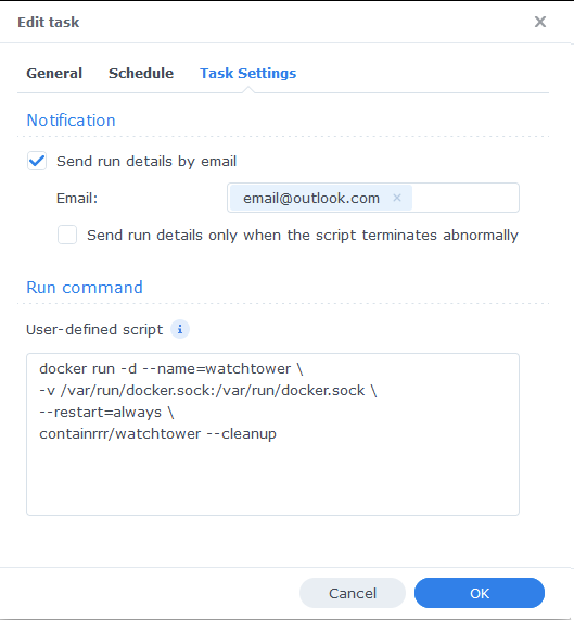 - tab Task Settings เลือกส่ง email แจ้งเตือนมาหาเรา แล้วก็ใส่เมลล์ตัวเองลงไป