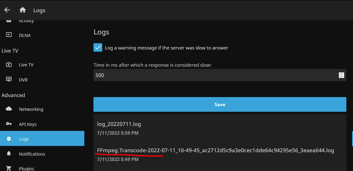 เริ่มจากใน Jellyfin ไปที่ Administration > Dashboard ดูในส่วน Advanced > Logs แล้วมองหา log ที่ขึ้นด้วย FFmgeg.Transcode