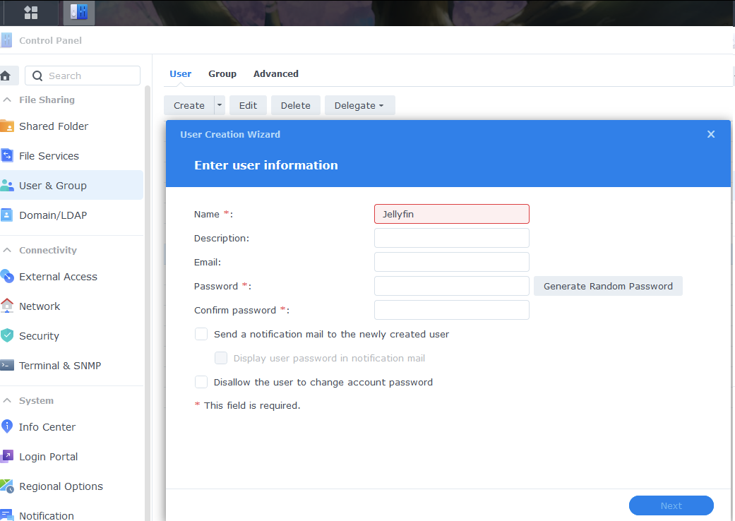 ไปที่ Control Panel > User & Group > User > Create สร้าง user Jellyfin ขึ้นมาให้ แล้วอย่าลืมให้สิทธ์ read write folder docker และ folder media อื่น ๆ ของคุณด้วย ไม่งั้นเวลาเปิด media folder ที่ไม่มีสิทธิ์มันจะไม่เห็นไฟล์อะไรเลย