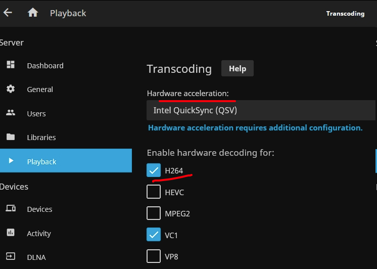 เริ่มจากใน Jellyfin ไปที่ Administration > Dashboard ดูในส่วน Server > Playback ดูตรง Hardware acceleration เลือกเป็น Intel Quick Sync หรือ VAAPI