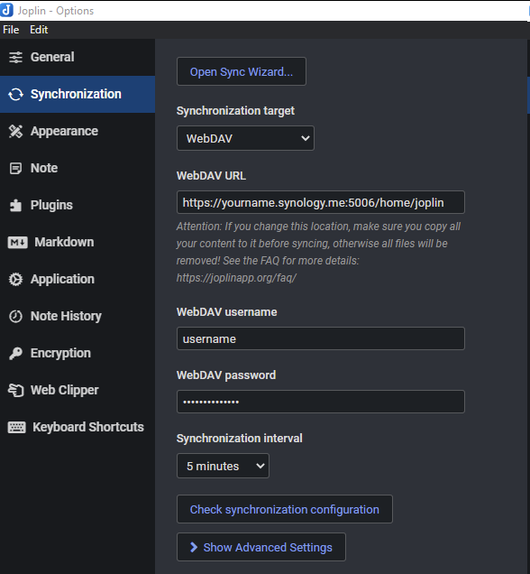 รวม ๆ ดูได้จาก https://github.com/laurent22/joplin#synchronisation ได้เลย รองรับหลากหลายวิธี สำหรับสาย Synology แบบเรา ๆ ที่สามารถใช้ได้คือ