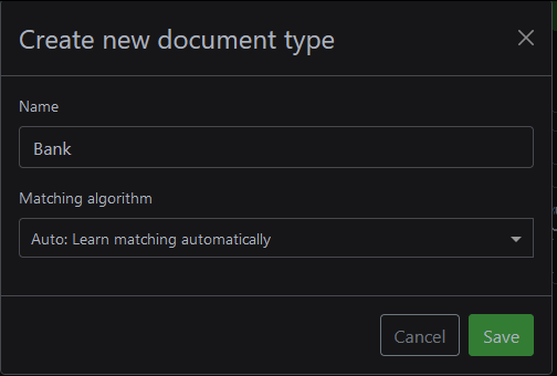 Matching algorithmเป็น Auto ให้ทำการตั้งประเภท document type และ tag เอกสารด้วยตัวเองเท่าที่จะทำได้ แยกเอกสารประเภทต่าง ๆ เช่น พวกใบเสร็จธนาคาร ก็ตั้งประเภท document type ว่าBankให้มีตัวอย่างจำนวนหนึ่ง แต่เยอะ ๆ ก็ยิ่งดี เพื่อเป็นตัวอย่างให้ neural network เอาไปศึกษาและจัดกลุ่มให้อัตโนมัติในอนาคต รายละเอียดไปอ่านที่ Automatic matching - ตัวอย่างประเภท document type ที่แนะนำเช่น ธนาคาร, ใบเสร็จ, ภาษี, ประกัน
