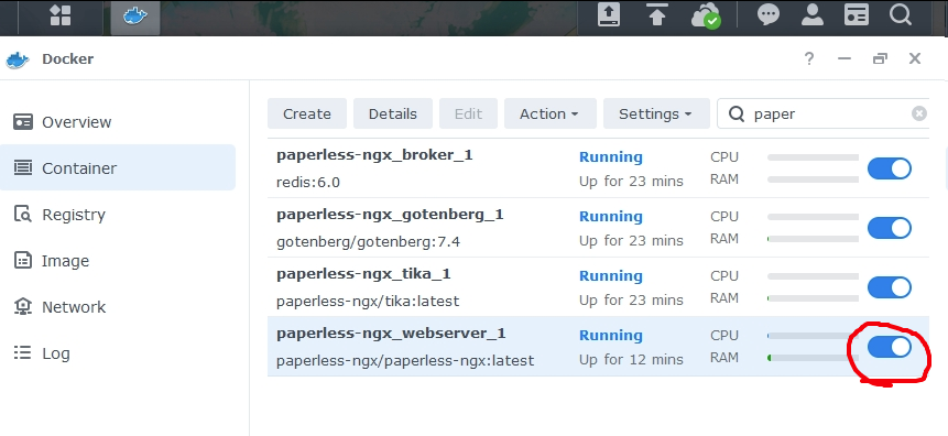 - หลังจากเรียบร้อยแล้วให้เปิด DSM ขึ้นมาแล้วไปที่ Docker ค้นหา paperless ตัวที่เป็น webserver และทำการปิดก่อน ตามที่วงไว้ในรูป หรือเลือกแล้วไปที่
