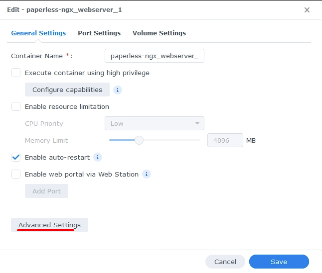 Editเพื่อเข้าไปด้านใน และกดที่Advance Settingsโดยส่วนนี้จะเป็นส่วนที่ใช้จัดการ env ซึ่งหากต้องการปรับแต่ง config ต่าง ๆ ของ paperless-ngx ก็สามารถทำได้ในนี้ เช่นเปลี่ยนPAPERLESS_URLให้เป็น Reverse Proxy