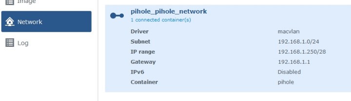 หลังจากติดตั้งเสร็จแล้ว pihole จะขึ้นไปแสดงใน tab Container เอง โดยหากดูที่ tab Network ก็จะเห็น macvlan แสดงขึ้นมาด้วย