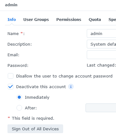 - ทำการ deactivate admin account เดิม โดยไปที่ Control Panel > User & Group